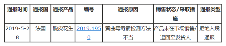 據(jù)歐盟食品飼料類快速預(yù)警系統(tǒng)(RASFF)消息,2019年5月28日,法國通過RASFF通報(bào)我國出口花生不合格。