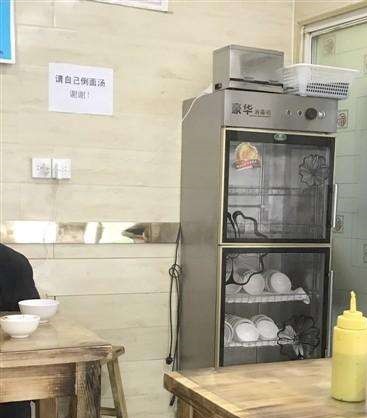 市民李先生向記者反映,他發(fā)現(xiàn)一些面館、小吃店等擺放的消毒柜形同虛設(shè),“從消毒碗柜拿出來(lái)的餐具經(jīng)常濕漉漉的,還有些消毒柜根本沒(méi)放餐具,成了雜物柜。”6月29日,記者來(lái)到城西區(qū)微波巷一家小吃店,只見(jiàn)店內(nèi)的消毒柜擺放在顯眼處,打開(kāi)一看,里面擺滿了碗,碗下面墊著一層白色的毛巾,旁邊的電線耷拉在一旁,并沒(méi)有通電。當(dāng)記者問(wèn)及為何沒(méi)有通電時(shí),服務(wù)員說(shuō)因?yàn)閯偨o自己手機(jī)充電,所以拔下了消毒柜的電源。隨后,記者又來(lái)到夏都大街一家火鍋店,店內(nèi)的消毒柜內(nèi)雖然擺放著碗筷,但同樣沒(méi)有插上電源。一名女服務(wù)員說(shuō):“忘記插電了?!庇浾唠S后又走訪了海湖新區(qū)部分中小餐館,發(fā)現(xiàn)大多數(shù)餐館配備了消毒柜,但一部分呈斷電狀態(tài),有的甚至成了雜物柜,根本沒(méi)有起到消毒殺菌作用。