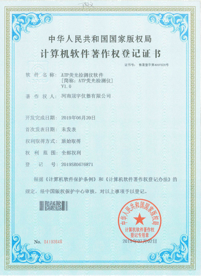近日,河南冠宇儀器有限公司(以下簡稱:冠宇儀器)繼之前的多項(xiàng)軟件著作權(quán)證書及專利證書之后,又獲由中華人民共和國國家版權(quán)局頒發(fā)的一項(xiàng)“ATP熒光檢測儀計(jì)算機(jī)軟件著作權(quán)登記證書”,一系列的權(quán)威肯定,彰顯了冠宇儀器強(qiáng)大的技術(shù)研發(fā)能力,也體現(xiàn)出公司為客戶提供優(yōu)質(zhì)產(chǎn)品的強(qiáng)大決心。