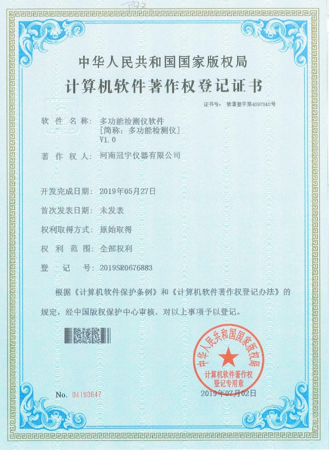 近日,河南冠宇儀器有限公司(以下簡(jiǎn)稱:冠宇儀器)繼之前的多項(xiàng)軟件著作權(quán)證書(shū)及專利證書(shū)之后,又獲由中華人民共和國(guó)國(guó)家版權(quán)局頒發(fā)的一項(xiàng)“多功能食品安全檢測(cè)儀計(jì)算機(jī)軟件著作權(quán)登記證書(shū)”,一系列的權(quán)威肯定,彰顯了冠宇儀器強(qiáng)大的技術(shù)研發(fā)能力,也體現(xiàn)出公司為客戶提供優(yōu)質(zhì)產(chǎn)品的強(qiáng)大決心。