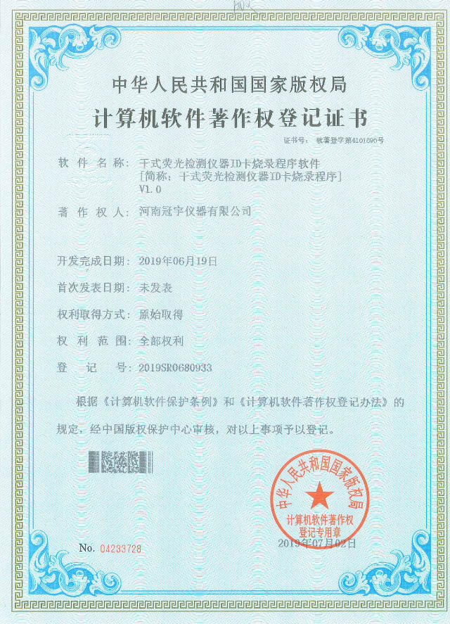 近日,河南冠宇儀器有限公司(以下簡稱:冠宇儀器)繼之前的多項軟件著作權(quán)證書及專利證書之后,又獲由中華人民共和國國家版權(quán)局頒發(fā)的一項“干式熒光檢測儀器ID卡燒錄程序計算機軟件著作權(quán)登記證書”,一系列的權(quán)威肯定,彰顯了冠宇儀器強大的技術(shù)研發(fā)能力,也體現(xiàn)出公司為客戶提供優(yōu)質(zhì)產(chǎn)品的強大決心。