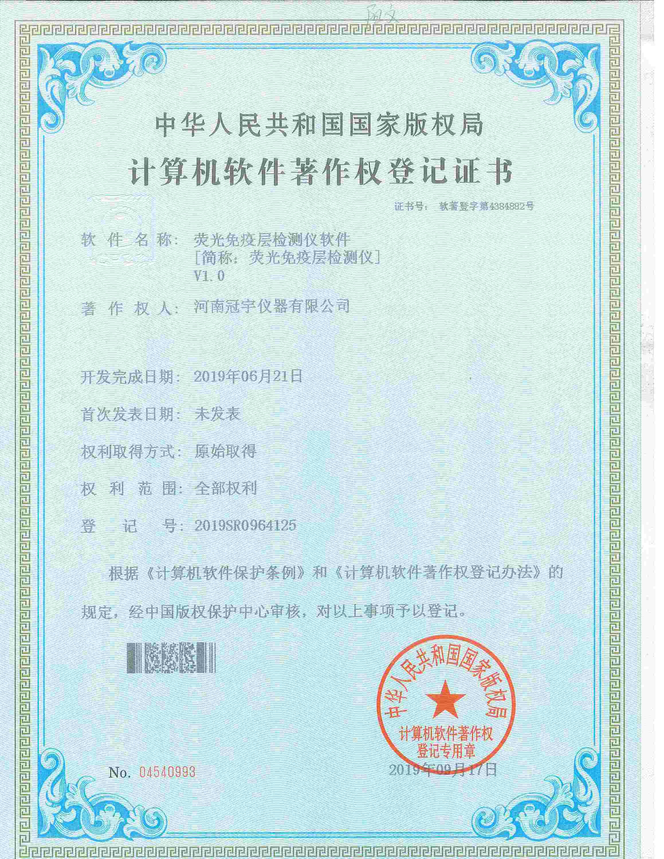 近日,河南冠宇儀器有限公司(以下簡稱:冠宇儀器)繼之前的多項軟件著作權(quán)證書及專利證書之后,又獲由中華人民共和國國家版權(quán)局頒發(fā)的一項“熒光免疫層檢測儀計算機軟件著作權(quán)登記證書”,一系列的權(quán)威肯定,彰顯了冠宇儀器強大的技術(shù)研發(fā)能力,也體現(xiàn)出公司為客戶提供優(yōu)質(zhì)產(chǎn)品的強大決心。