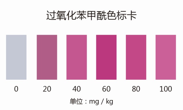 1.3:顯色10min后立即與比色卡對照,找出相應的含量。如顏色有變紅則說明可能摻有過氧化苯甲酰,顏色越深,含量越高。