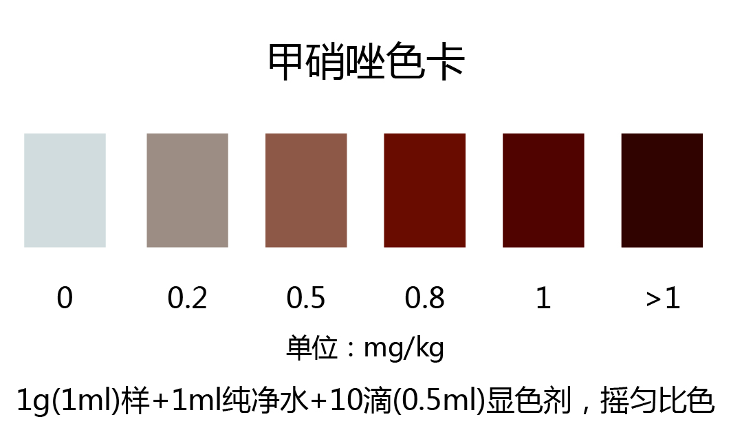 取1g(1ml)樣品于試管中,加入1ml純凈水,搖勻,加入10滴(0.5ml)檢測(cè)液,60±10℃水浴加熱2分鐘,取出后進(jìn)行比色,顏色越深,甲硝唑的含量越高。