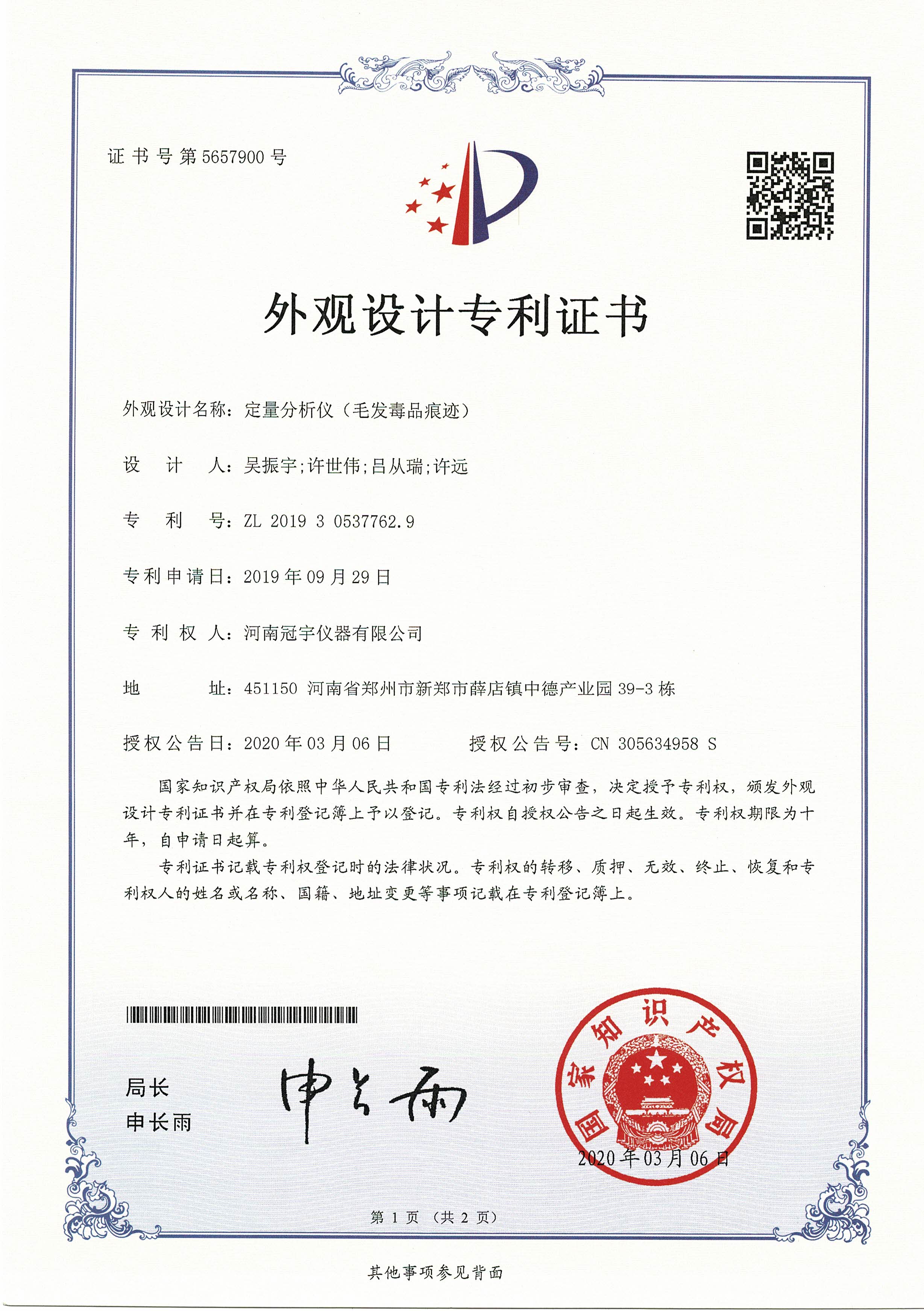 近日,河南冠宇儀器有限公司(以下簡(jiǎn)稱:冠宇儀器)繼之前的多項(xiàng)軟件著作權(quán)證書及專利證書之后,又獲由國(guó)家知識(shí)產(chǎn)權(quán)局頒發(fā)的一項(xiàng)“定量分析儀(毛發(fā)毒品痕跡)外觀設(shè)計(jì)專利證書”,一系列的權(quán)威肯定,彰顯了冠宇儀器強(qiáng)大的技術(shù)研發(fā)能力,也體現(xiàn)出公司為客戶提供優(yōu)質(zhì)產(chǎn)品的強(qiáng)大決心。