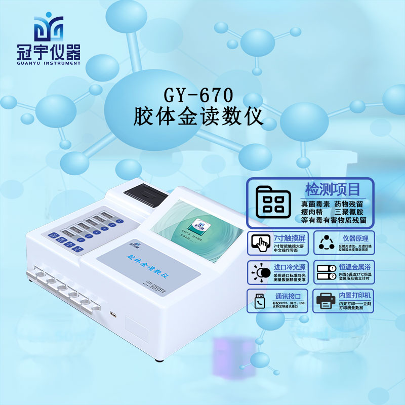 冠宇儀器膠體金檢測(cè)儀GY-610應(yīng)用膠體金免疫層析技術(shù)的原理,通過(guò)反射光譜法測(cè)試CT線強(qiáng)弱程度可以檢測(cè)生化卡、金標(biāo)卡及液態(tài)滴定模塊制成的獸藥、瘦肉精、抗生素、動(dòng)物疫病、農(nóng)藥殘留、臨床疫病、水質(zhì)安全、等有毒有害物質(zhì)殘留項(xiàng)目。