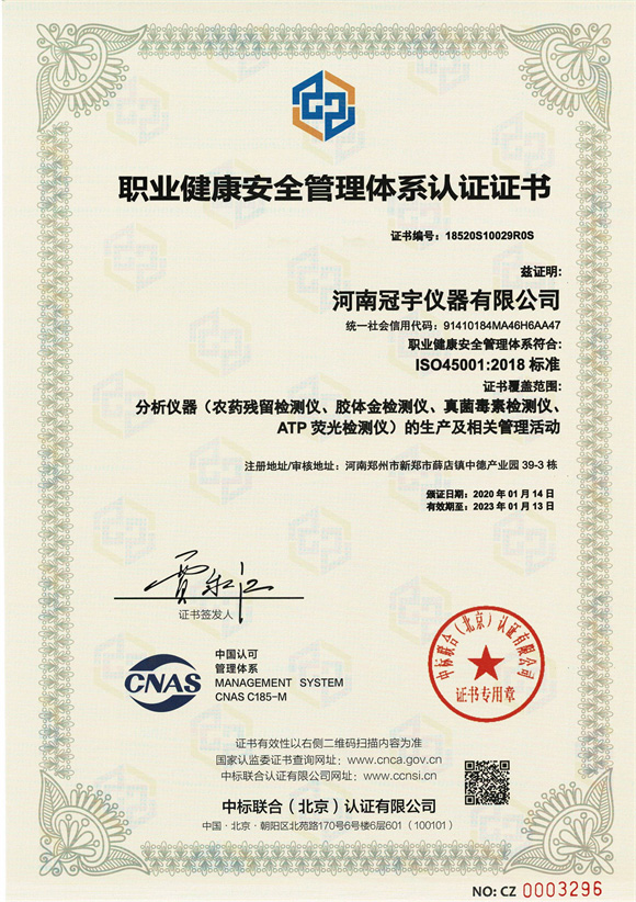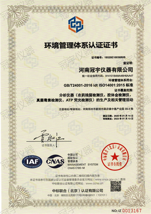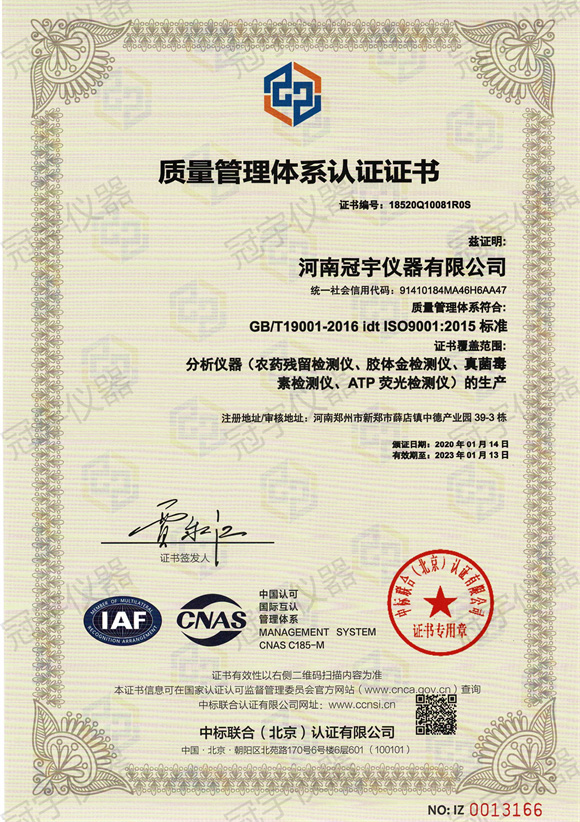 河南冠宇儀器有限公司(以下簡稱:冠宇儀器)繼之前的多項軟件著作權(quán)證書及專利證書之后,也獲得了ISO三體認(rèn)證。