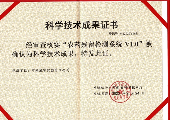 河南冠宇儀器有限公司(以下簡稱:冠宇儀器)繼多項(xiàng)軟件著作權(quán)證書、實(shí)用新型專利證書、計(jì)算機(jī)軟件著作權(quán)等一系列證書之后,又獲由河南省科學(xué)技術(shù)廳頒發(fā)的一項(xiàng)“農(nóng)藥殘留檢測系統(tǒng)V1.0科學(xué)技術(shù)成果證書”,一系列的權(quán)威肯定,彰顯了冠宇儀器強(qiáng)大的技術(shù)研發(fā)能力,也體現(xiàn)出公司為客戶提供優(yōu)質(zhì)產(chǎn)品的強(qiáng)大決心。