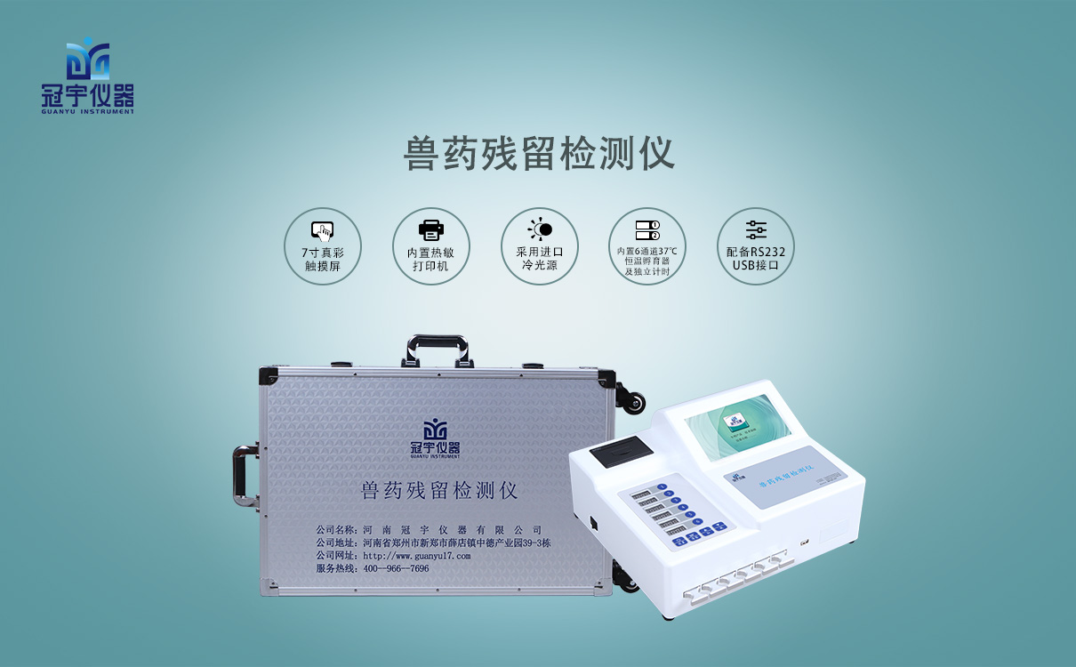 綜上,必須采取有效措施,減少和控制獸藥殘留的發(fā)生。河南冠宇儀器有限公司研制出一款獸藥殘留檢測(cè)儀可現(xiàn)場(chǎng)檢測(cè)食品、肉制品、糧食、化妝品、食用油等樣品中抗生素殘留、毒素、激素及非法添加。如:氯霉素、氰霉素、鹽酸克侖特羅、萊克多巴胺、沙丁胺醇、黃曲霉毒素等數(shù)十種項(xiàng)目。應(yīng)用競(jìng)爭(zhēng)抑制免疫層析的原理,通過(guò)檢測(cè)線熒光定量卡中的熒光強(qiáng)弱程度,定量分析待檢樣品中獸藥殘留。廣泛應(yīng)用于食品藥品監(jiān)督管理局,高等院校,科研院所,農(nóng)業(yè)部門,衛(wèi)生部門,屠宰場(chǎng),畜牧獸醫(yī),農(nóng)場(chǎng),食品肉制品深加工企業(yè),檢驗(yàn)檢疫部門。