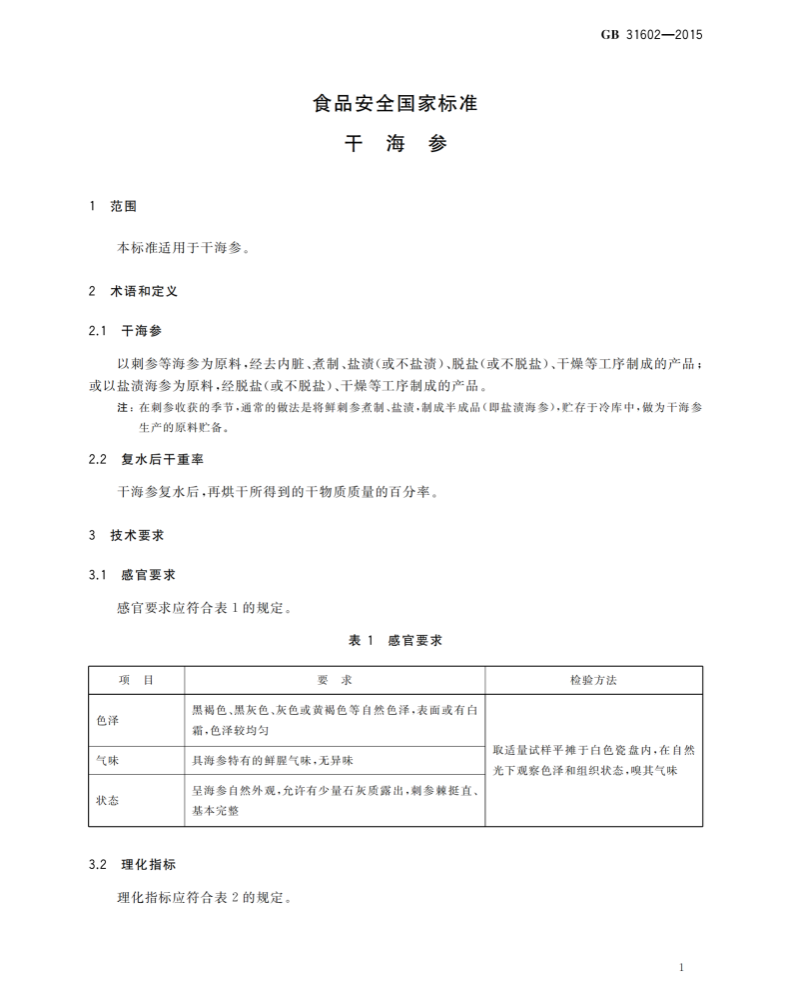 GB 31602-2015 食品安全國家標(biāo)準(zhǔn) 干海參之感官要求及理化指標(biāo)