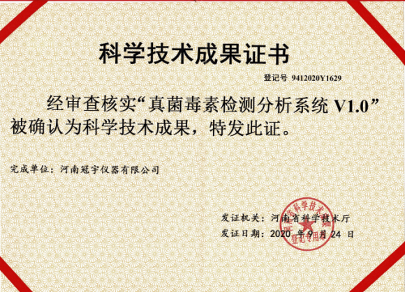 河南冠宇儀器有限公司(以下簡稱:冠宇儀器)繼多項軟件著作權證書、實用新型專利證書、計算機軟件著作權等一系列證書之后,又獲由河南省科學技術廳頒發(fā)的一項“真菌毒素檢測分析系統(tǒng)V1.0科學技術成果證書”,一系列的權威肯定,彰顯了冠宇儀器強大的技術研發(fā)能力,也體現出公司為客戶提供優(yōu)質產品的強大決心。