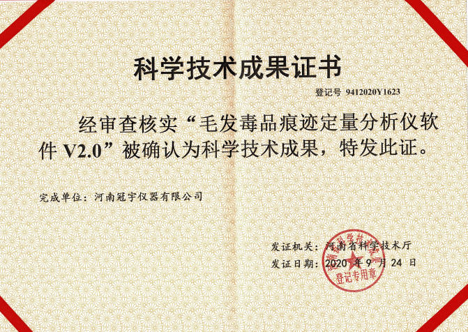 河南冠宇儀器有限公司(以下簡稱:冠宇儀器)繼多項軟件著作權(quán)證書、實用新型專利證書、計算機軟件著作權(quán)等一系列證書之后,又獲由河南省科學技術(shù)廳頒發(fā)的一項“毛發(fā)毒品痕跡定量分析與軟件V2.0科學技術(shù)成果證書”,一系列的權(quán)威肯定,彰顯了冠宇儀器強大的技術(shù)研發(fā)能力,也體現(xiàn)出公司為客戶提供優(yōu)質(zhì)產(chǎn)品的強大決心。