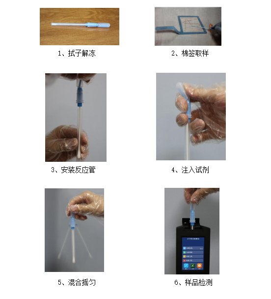 6、樣本檢測:將拭子插入處于待檢測界面的ATP儀器實(shí)驗(yàn)倉內(nèi),閉合儀器上蓋,開始檢測。