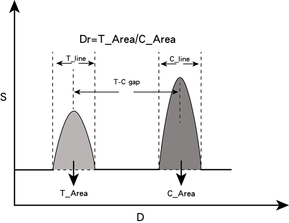 GY-710真菌毒素殘留定量分析儀應用時間分辨熒光競爭抑制免疫層析的原理,樣本中若含有真菌毒素殘留,則在側向移動的過程中會與熒光微球標記的特異性單克隆抗體反應,抑制抗體和NC 膜檢測線上偶聯(lián)物的結合。如果樣本中真菌毒素殘留含量的高,結合于檢測線上的抗體量就會減少,檢測線熒光強度也隨之變弱,用真菌毒素殘留定量分析儀獲取層析試紙T線和C線上光吸收峰信號,據此計算出兩個峰面積之比(Dr),然后根據不同梯度標準濃度和峰面積的比值制 作標準曲線;在實際的測試過程中,通過真菌毒素殘留定量分析儀內置的標準曲線求得待檢樣品中真菌毒素殘留含量。