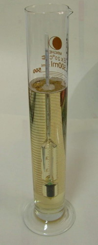 1.1:將蜂蜜輕輕混勻,再輕輕倒入250mL量筒中(取樣量約300mL),將潔凈干燥的蜂蜜比重計(jì)(波美計(jì))輕 輕插入蜂蜜中央,任其自然下沉(下沉?xí)r間不少于15min)至不再下沉為止,水平觀察,按蜂蜜彎月面的上緣取讀數(shù),同時(shí)用溫度計(jì)測(cè)定蜂蜜溫度。