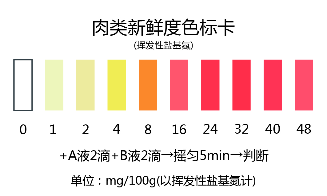 比色卡為每100g肉品中揮發(fā)性鹽基氮的大致含量,可根據(jù)下列指標確定肉品的新鮮度: