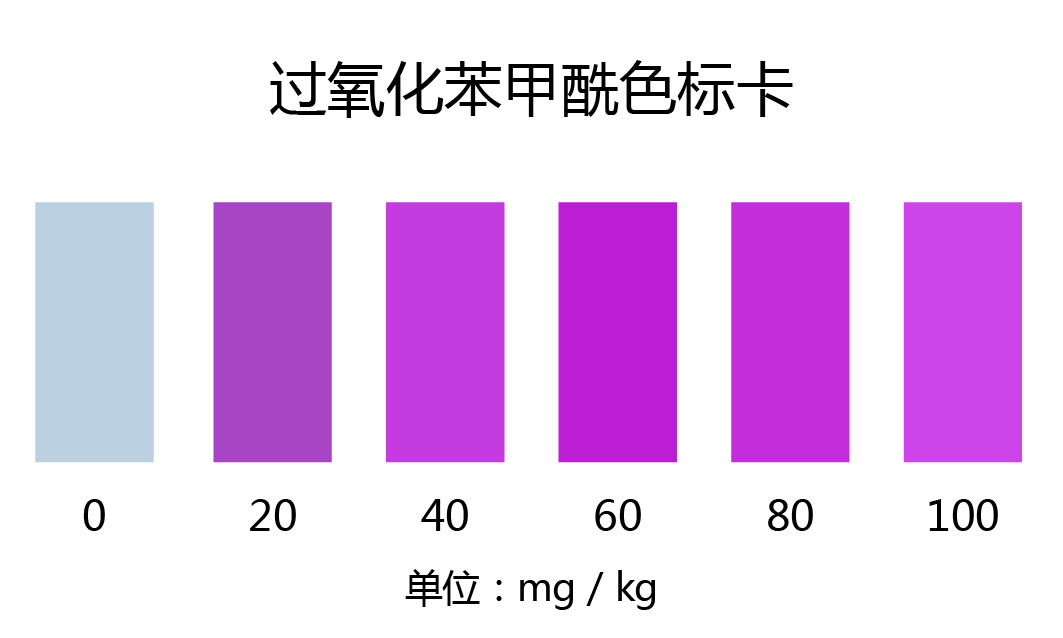 1.3:顯色10min后立即與比色卡對(duì)照,找出相應(yīng)的含量。如顏色有變紅則說(shuō)明可能摻有過(guò)氧化苯甲酰,顏色越深,含量越高。