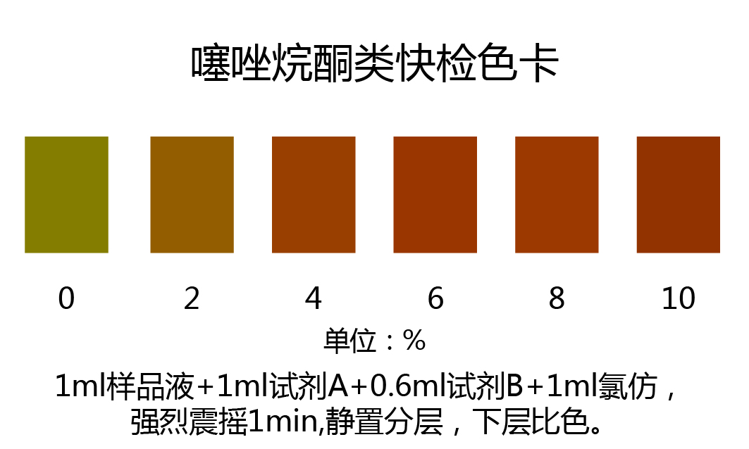 取上述濾液0.5 ml于玻璃比色皿或試管中,加入0.5 ml檢測試劑A,0.3 ml檢測試劑B,搖勻,加入1ml氯仿,強(qiáng)烈震搖1min,靜置分層,觀察下層顏色,對照色卡比色,噻唑烷酮類降血糖藥物含量越高,顏色越深;