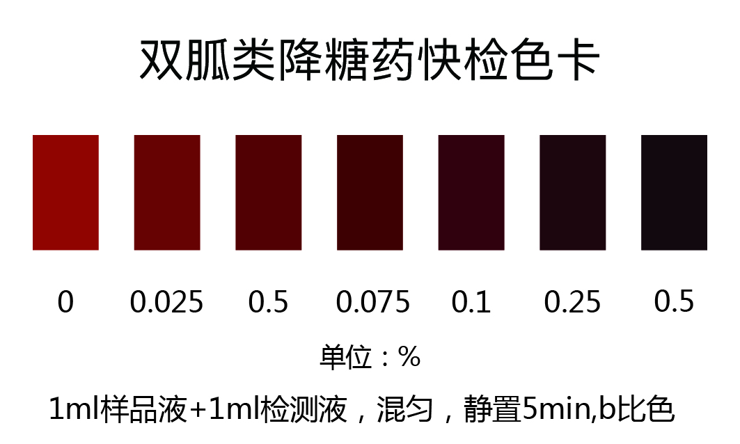 取上述濾液0.5 ml于玻璃比色皿或試管中,加入5滴檢測(cè)液,振蕩混勻,靜置5min,對(duì)照色卡比色,雙胍類降糖藥含量越高,顏色越深;