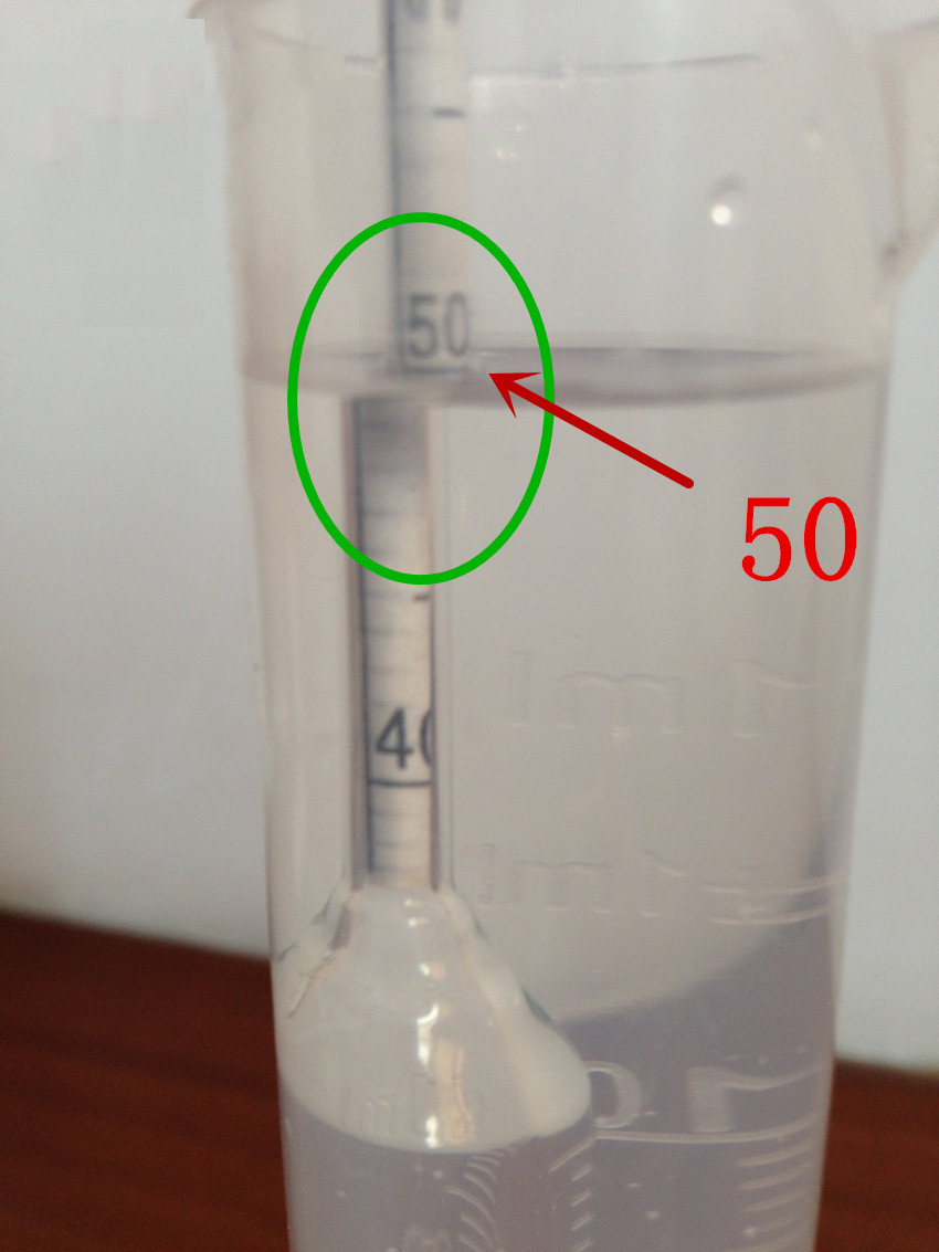 1.3:讀數(shù)按彎月面下緣讀數(shù),觀察者的眼睛應稍低于液面,使看到的液面成橢圓形,然后慢慢抬高眼睛位置直至橢圓形變成一條直線為止,讀出此直線的分度表上的位置(下右圖為50);